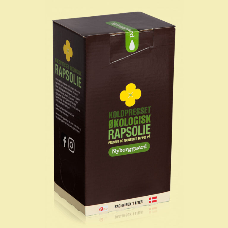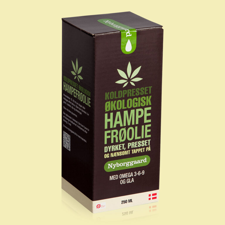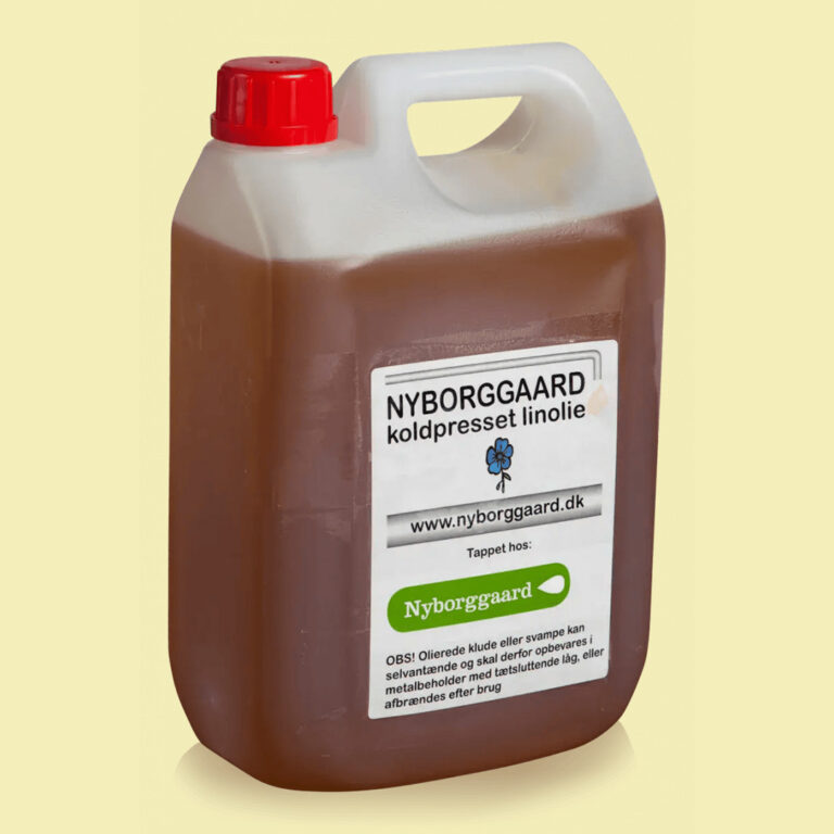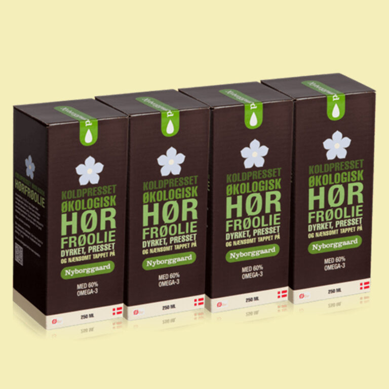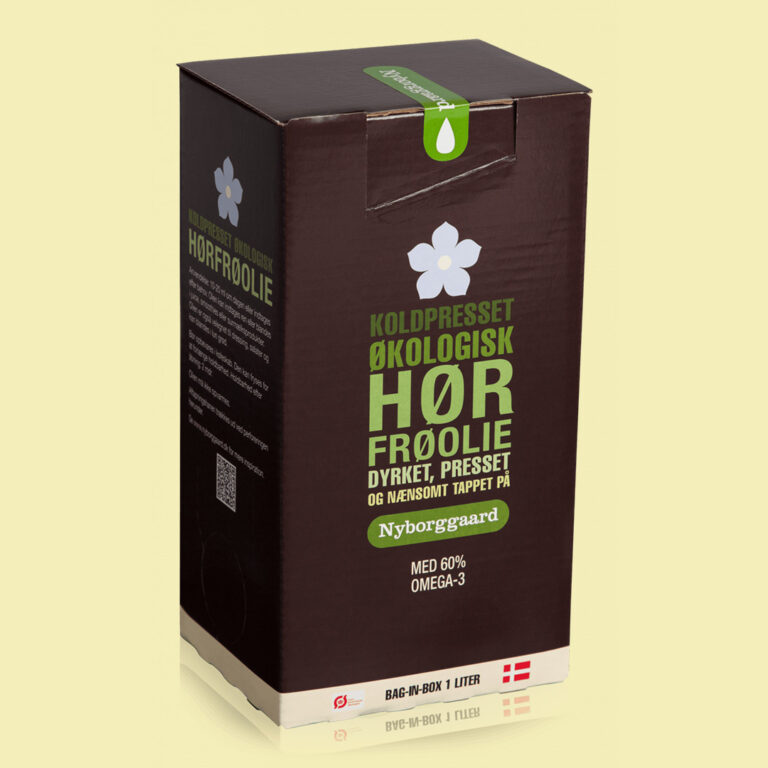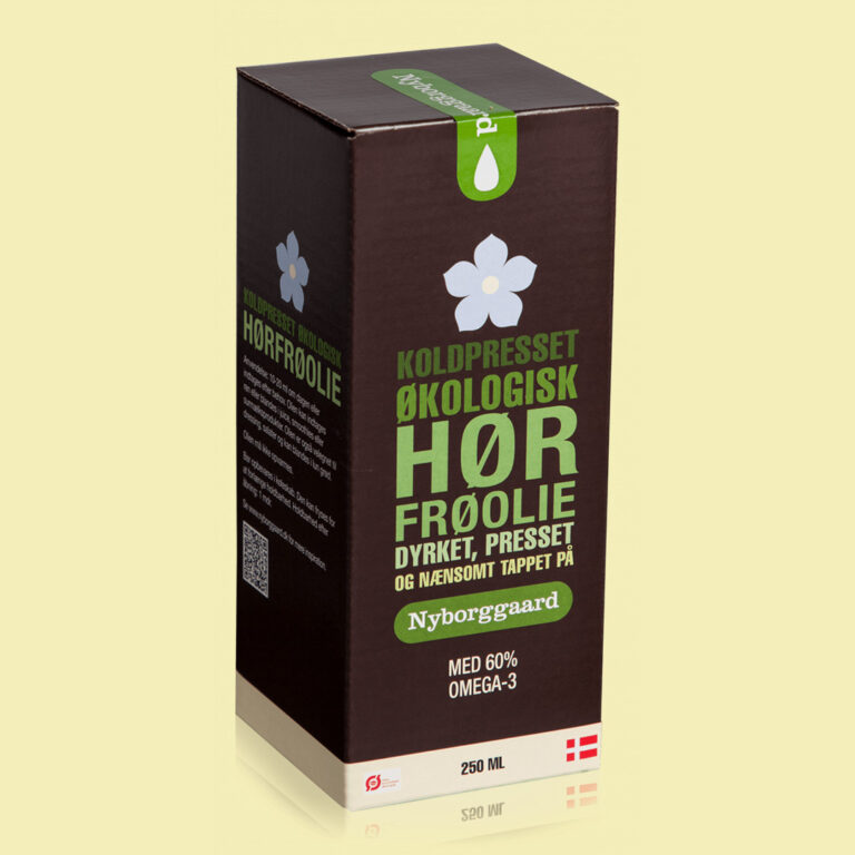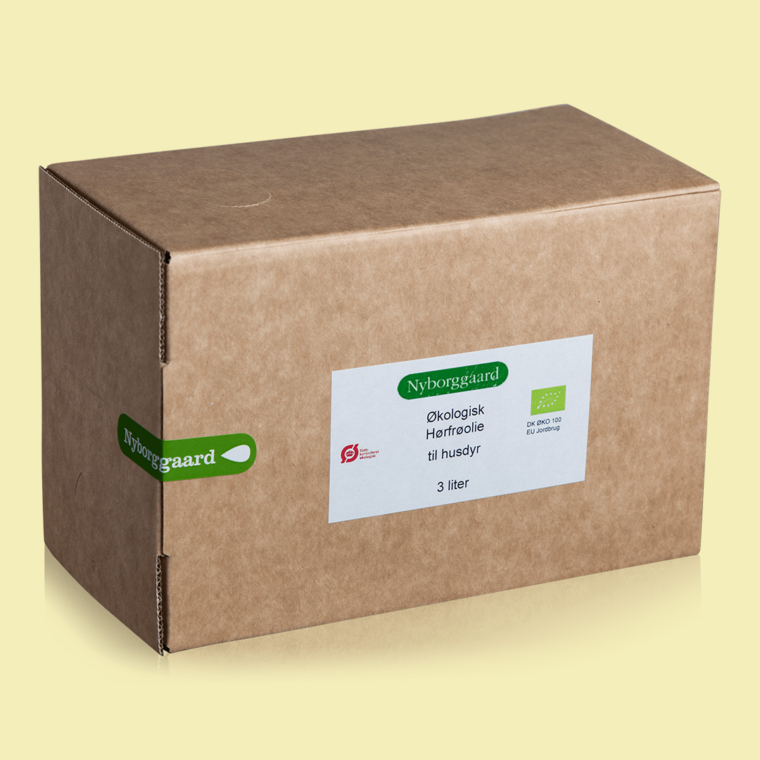 Økologisk dansk hørfrøolie af hjemmeavlede hørfrø koldpresset i beskyttende atmosfære på Nyborggaard. Hørfrøolien til husdyr indeholder ca. 60% omega-3. Olien kan indeholde lidt bundfald, men er ellers af samme kvalitet som hørfrøolien, vi sælger til spisebrug.